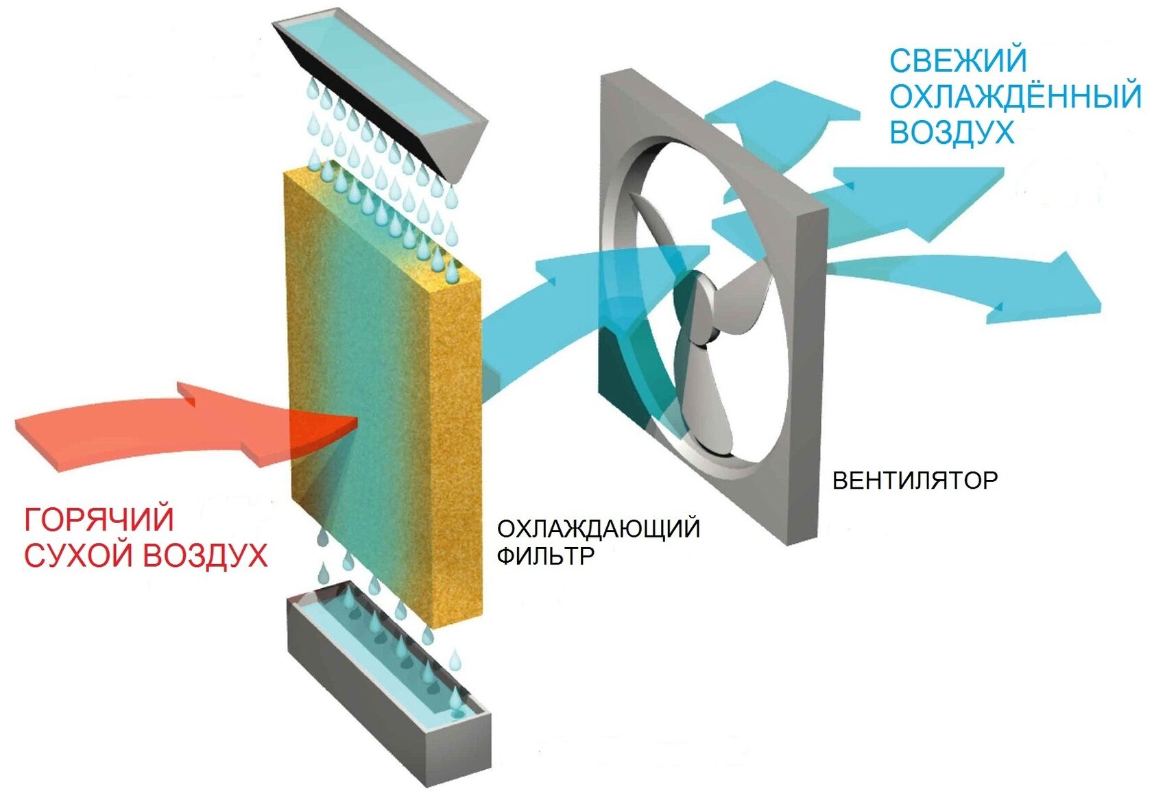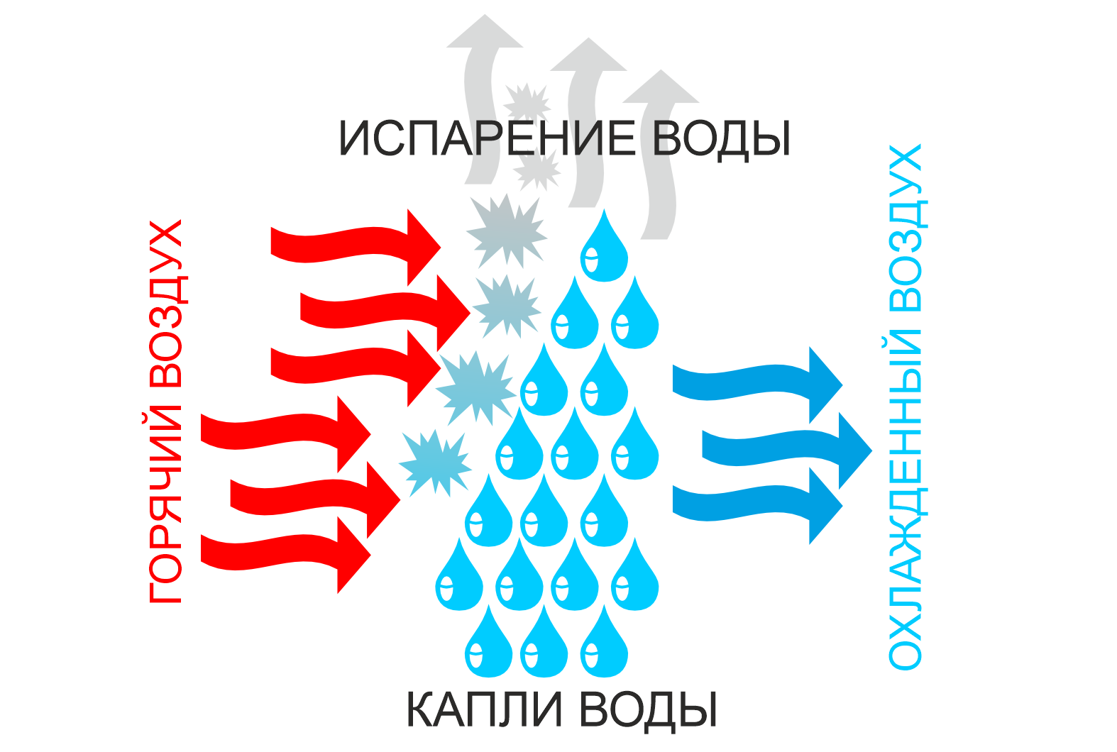 В этих системах вода, переходя в газообразное состояние, забирает тепло, необходимое для изменения своего агрегатного состояния: горячий воздух пропускается через влажный фильтр или распыленную воду — и в результате происходит испарение, а охлажденный воздух подается в помещение.
