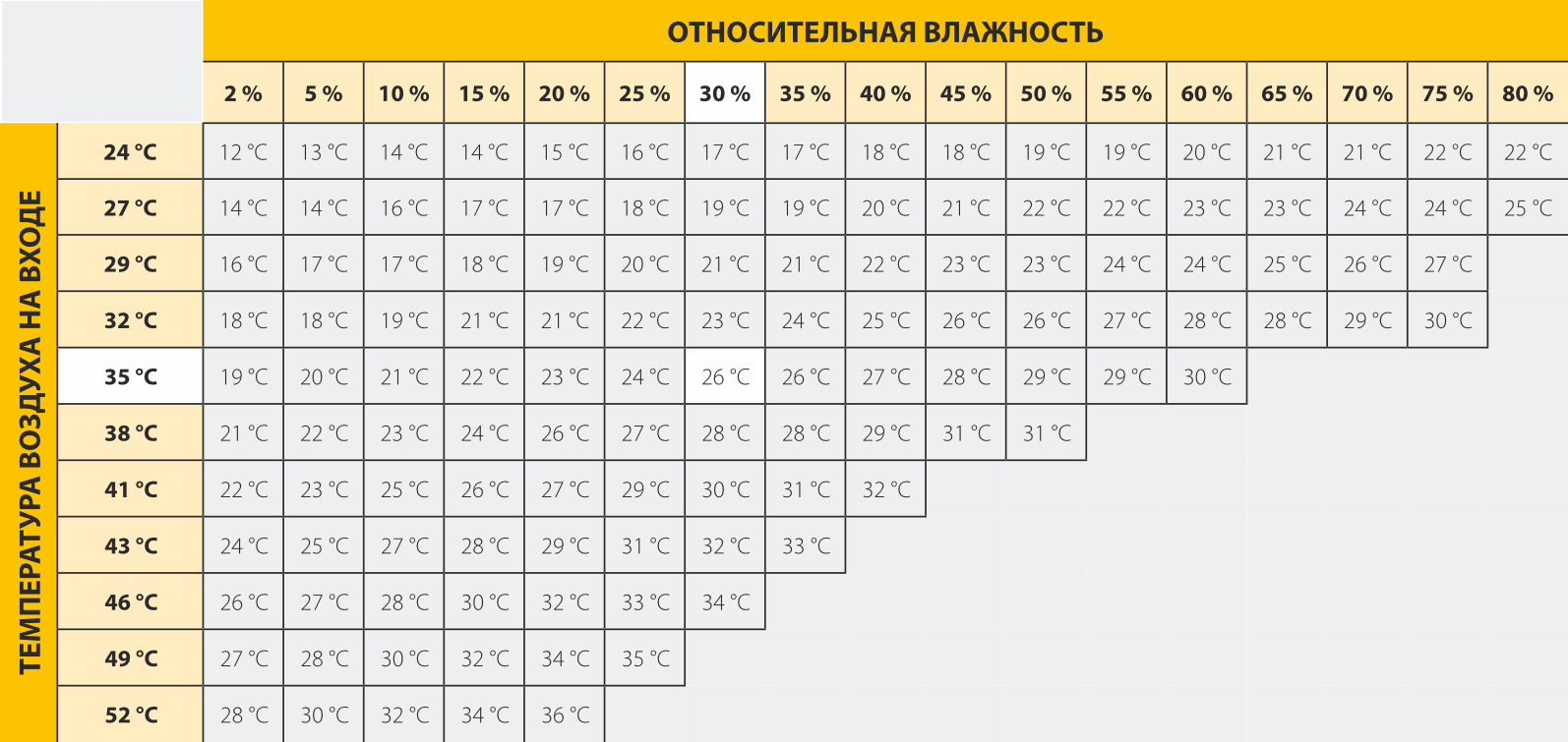 Отметьте температуру воздуха на входе и относительную влажность. Значение на пересечении строки и столбца будет теоретической температурой воздуха на выходе.
